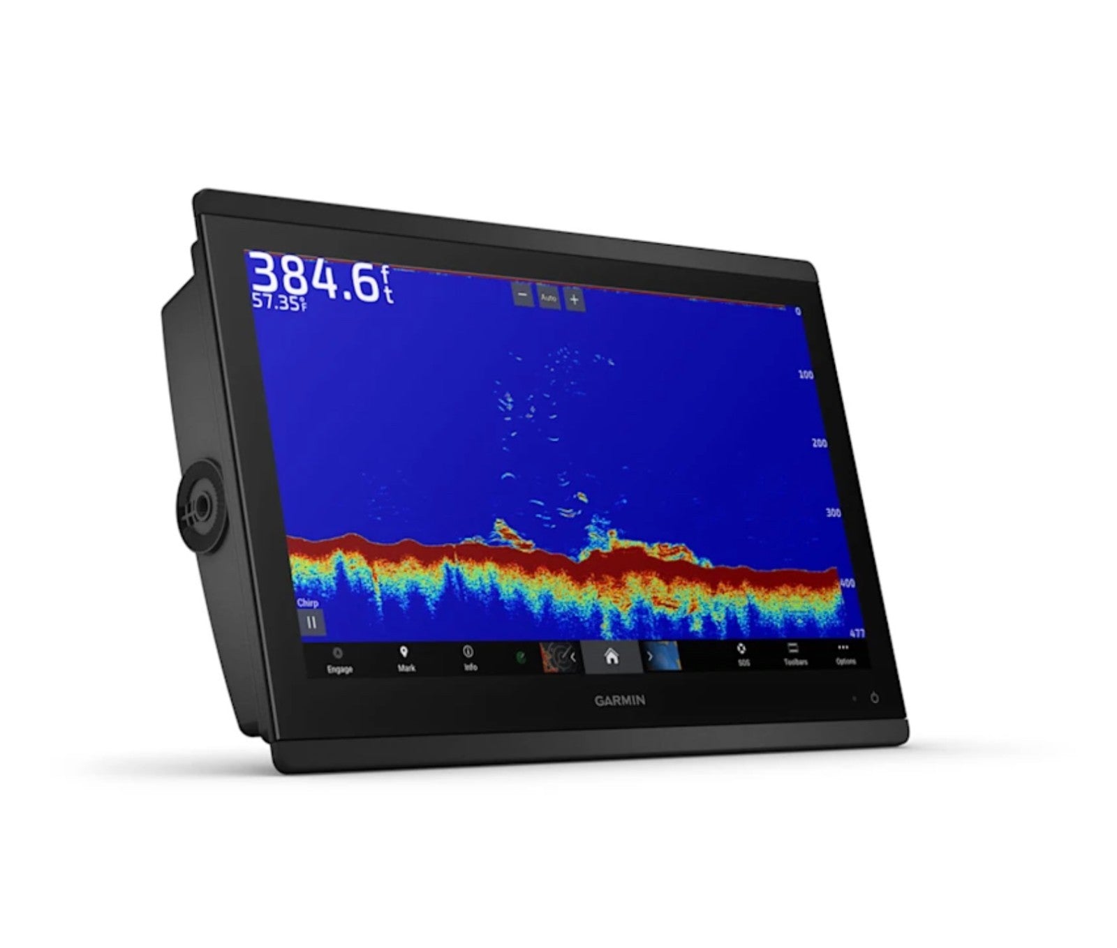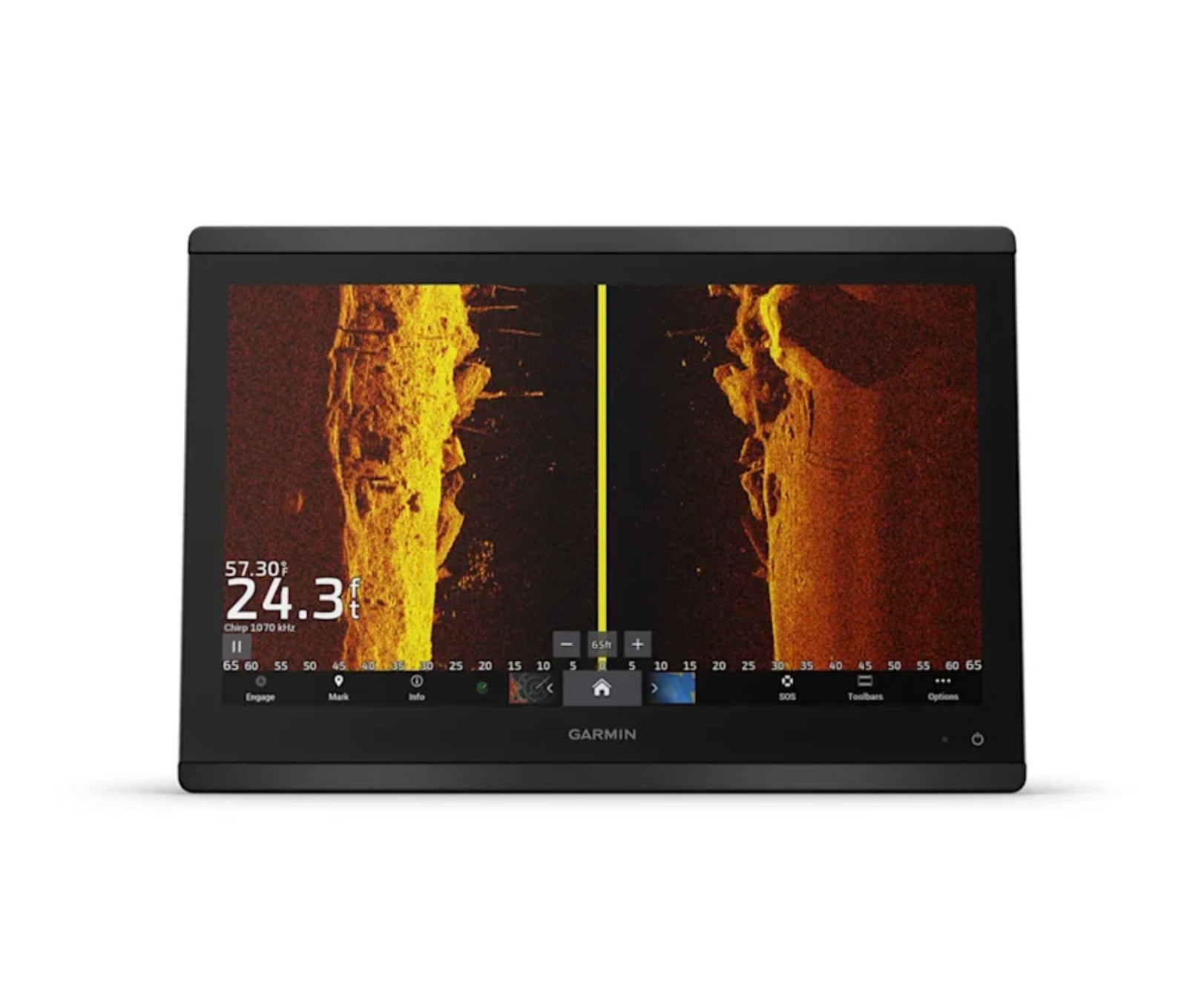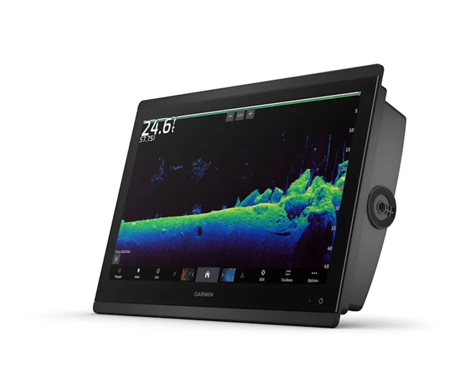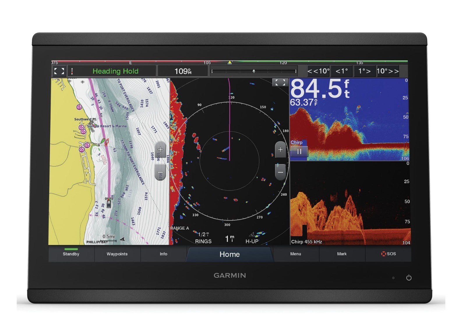 Built-in sonar with dual-channel CHIRP traditional (1 kW), CHIRP ClearVü, CHIRP SideVü, and UHD scanning sonar.