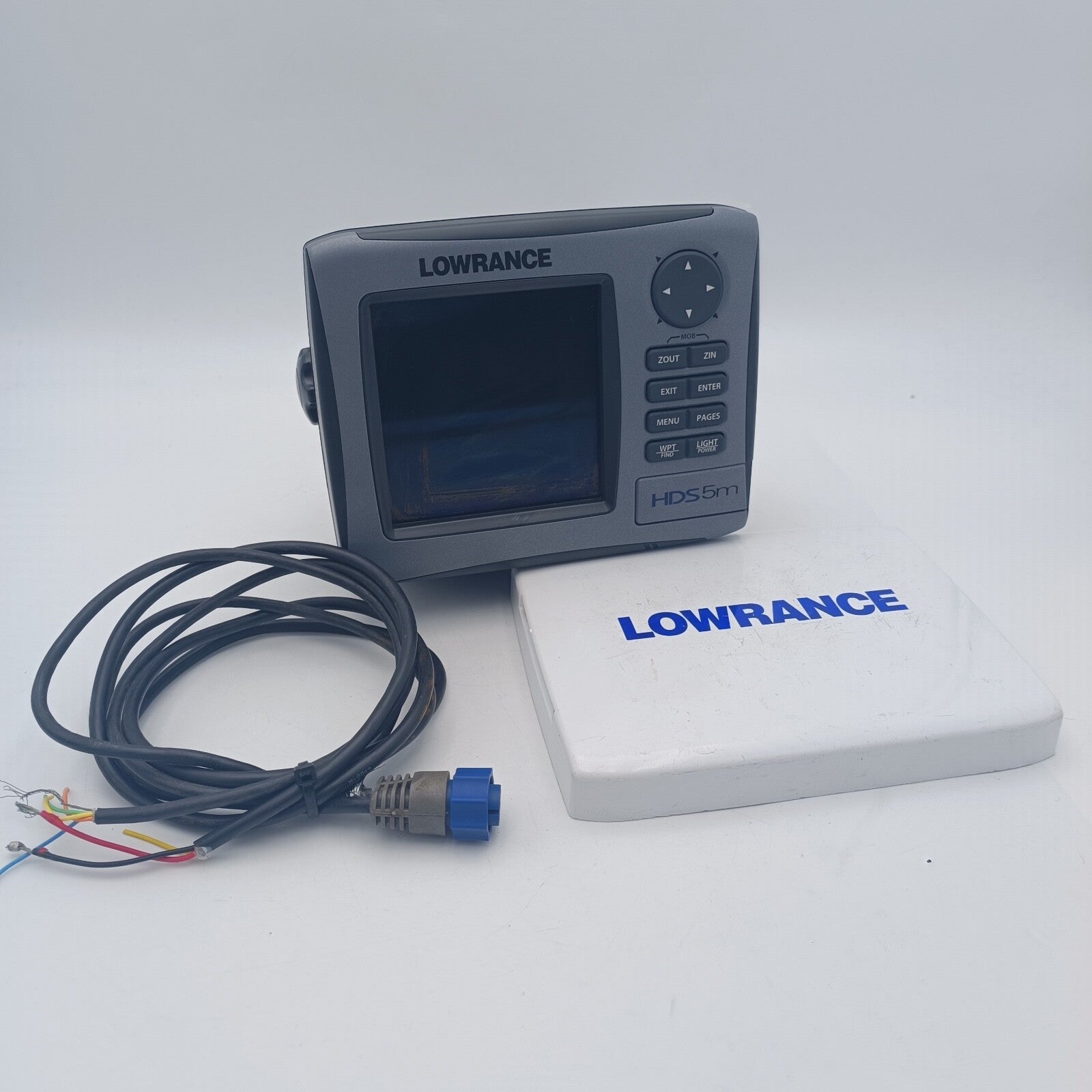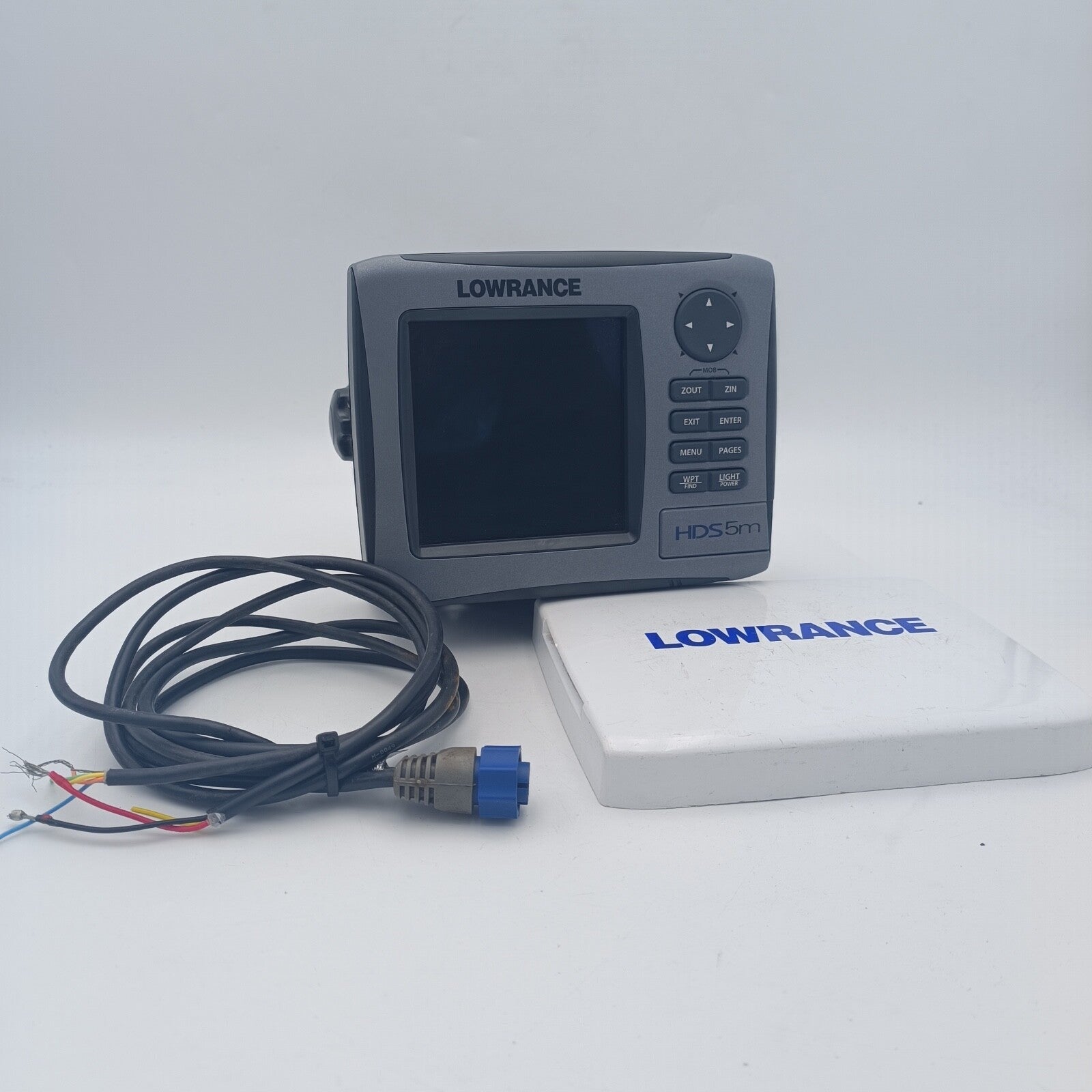 LOWRANCE HDS 5m GPS Chartplotter Overview Display 5 in./12.7 cm 16-bit color SolarMAX™ PLUS TFT Resolution High Contrast 480V x 480H Backlighting Flourescent cold cathode adjustable screen/keypad Communication NMEA 2000®, 0183 and Ethernet Languages 23 Media Port One (1) SD/MMC slot Display Display Resolution 480 x 480 (H x W) Display Type 16-bit color SolarMAX™ PLUS TFT Display: Backlighting Flourescent (CCFL) backlit screen, LED keypad backlight Backlighting Type Screen/Keypad Multi-language Display Yes GPS and Sonar Overlay Data Yes Split Screen Presentation Yes Display Size 5 in \ 127 mm Networking Connectors NMEA 0183 Interface Type 422 [(1) Tx (1) Rx] NMEA Output 0183/2000 Click here Technical/Environmental Operating Temperature (5F - 130F) (-15C - 55C) Casing Sealed and waterproof IPX7 Product Width 7.3 in \ 185 mm Product Depth 4 in \ 102 mm Product Height 5.8 in \ 147 mm Power Power Consumption 0.7A at 13 vDC with backlight on, 0.4A with backlight off Power Supply (Supply Voltage) 10 - 18 vDC Communications NMEA Input Yes Other Languages 32 Output Power [kW] Max 250W Broadband, analog equivalent 30,000W and 32W Broadband, analog equivalent 3,750 W Memory Card Capable One SD/MMC memory card slot The item is in perfect condition. Fully tested, works perfectly with warranty.