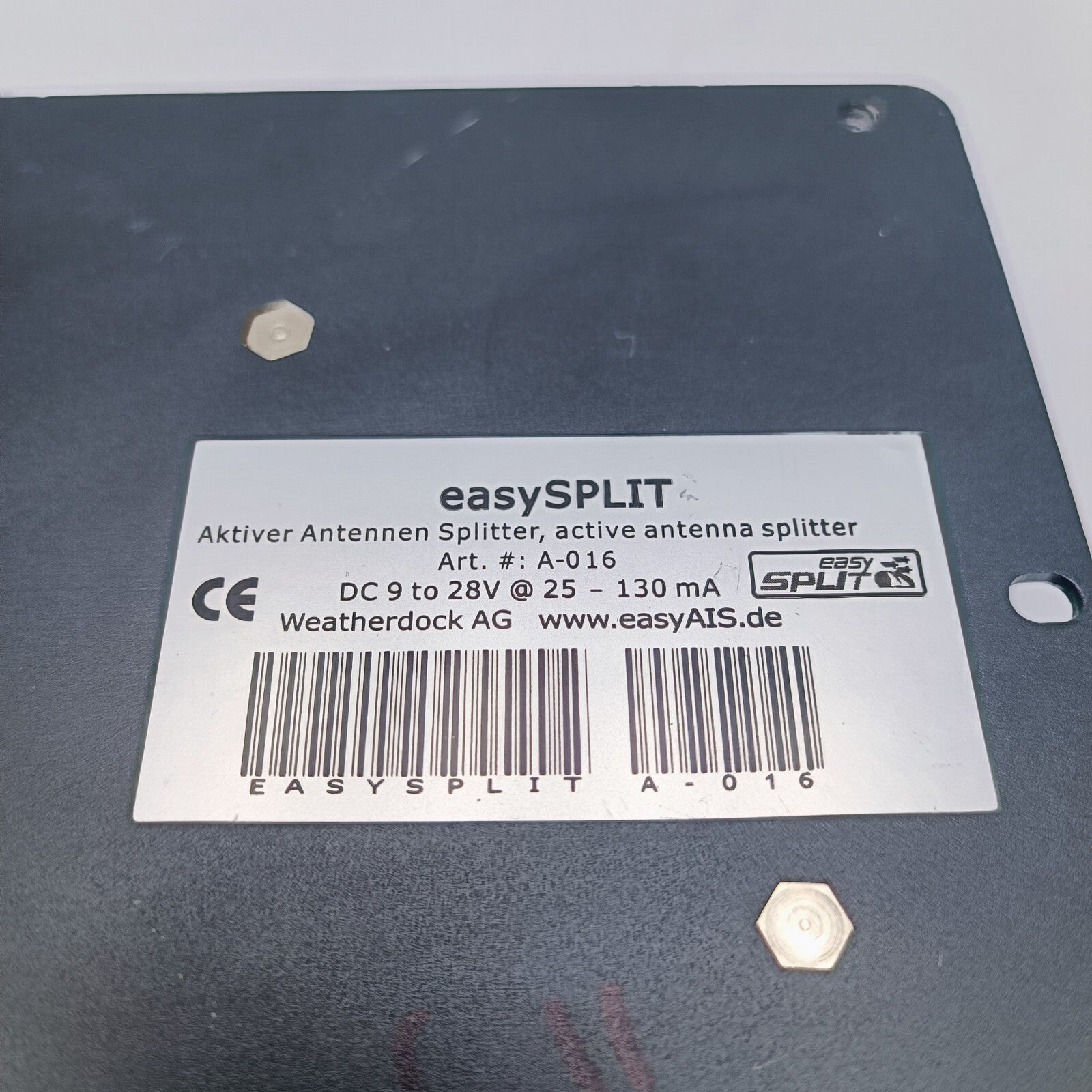 The easySPLIT allows the easy mounting of easyAIS to an already existing VHF antenna. With the easySPLIT, it is not necessary to install an additional antenna for the reception or the operation of an AIS receiver. Simply take the existing antenna cable of the marine radio and connect it to the splitter. Take a cable from the splitter to the radio and to the AIS receiver. Due to the extremely fast switching speed, the easySPLIT is also suitable for operation on ATIS radios. In addition, the easySPLIT has another output for the operation of a normal FM radio (for example a car radio). Delivery includes a power cable. CE approved. Dimensions: 150 x 150 x 30 mm, weight: 0.8 kg.