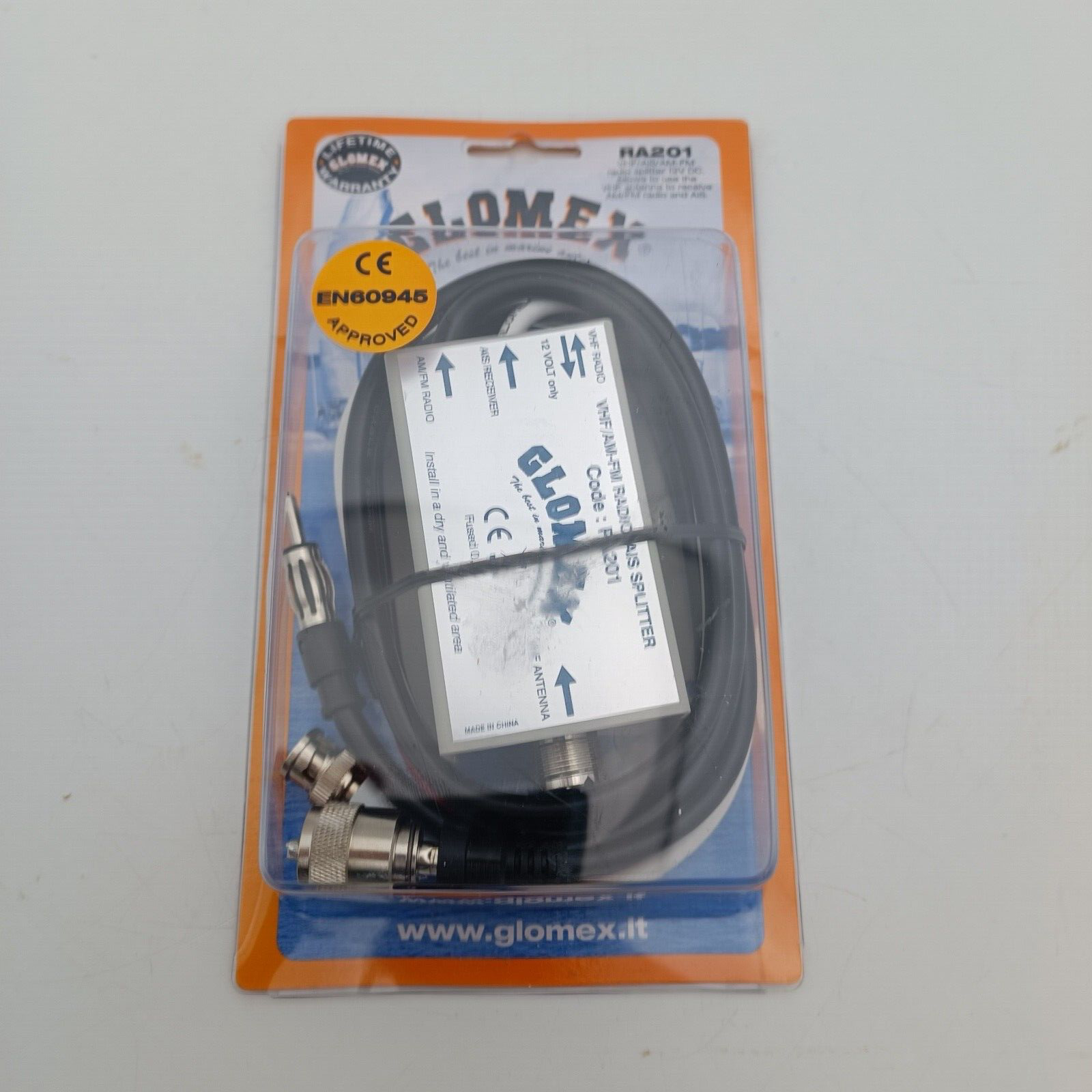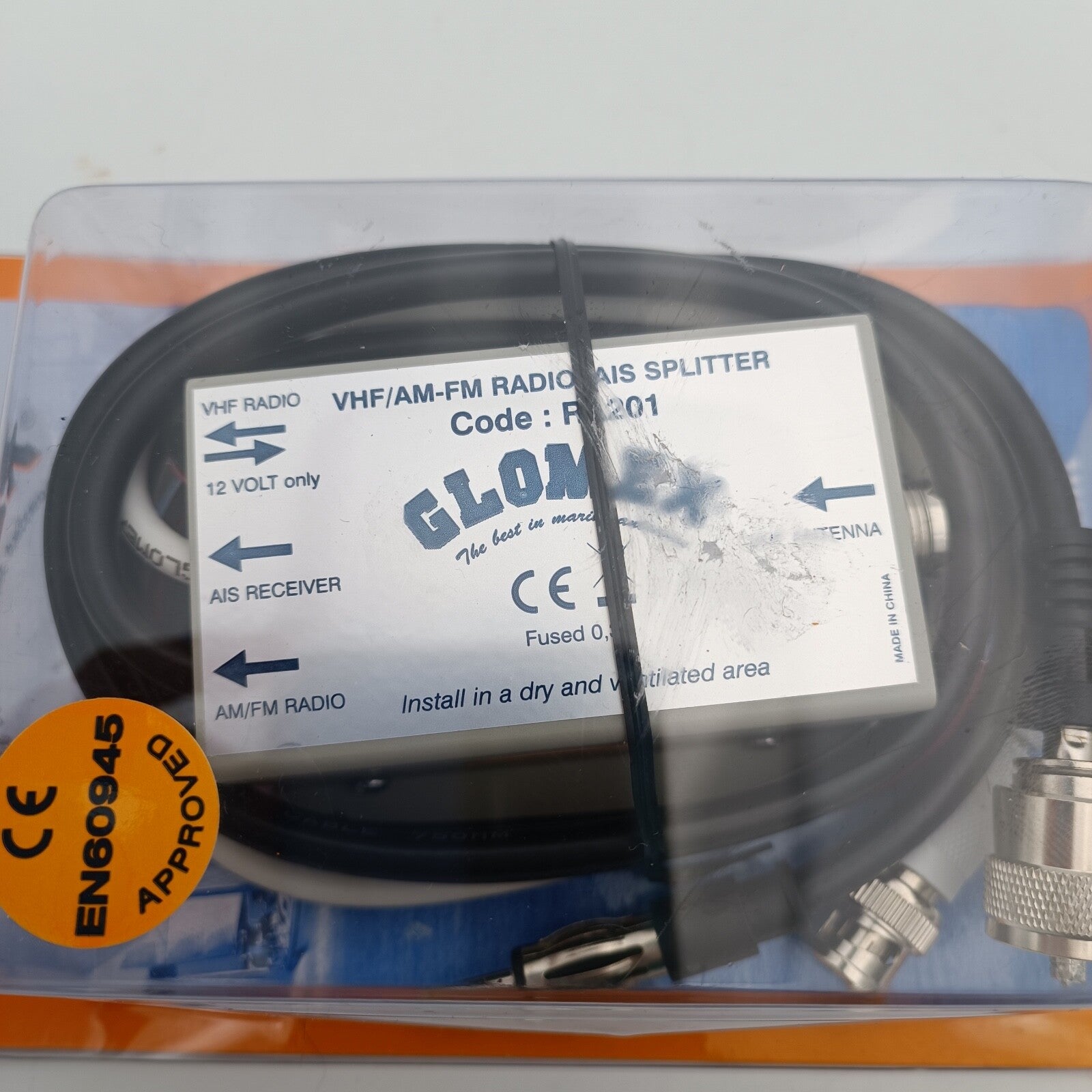 The marine radio antenna is connected with a SO-239 (PL-) socket on to the metal housing of the antenna splitter.