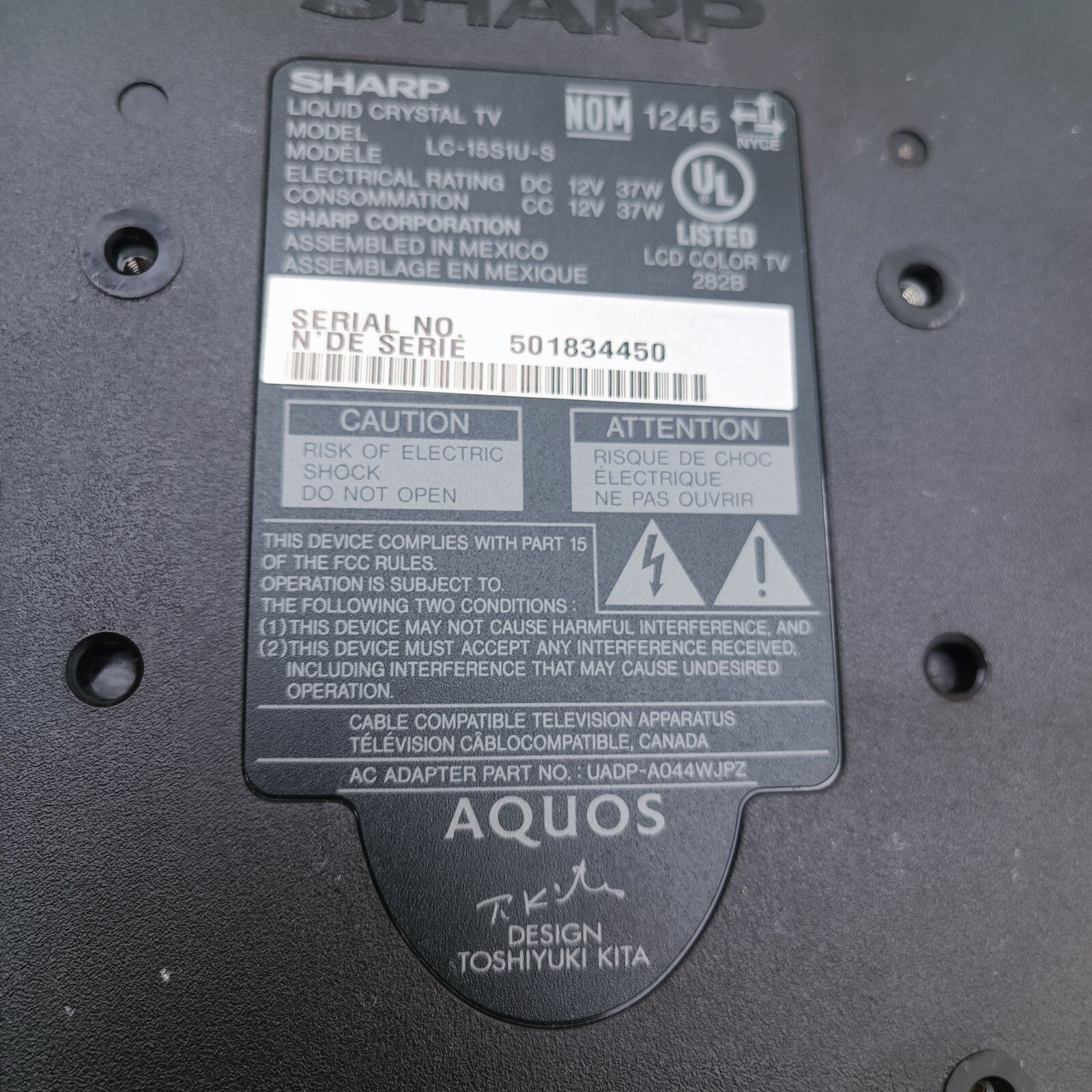 SHARP AQUOS Liquid crystal TV. LC-15S1U-S. 12V 37W.