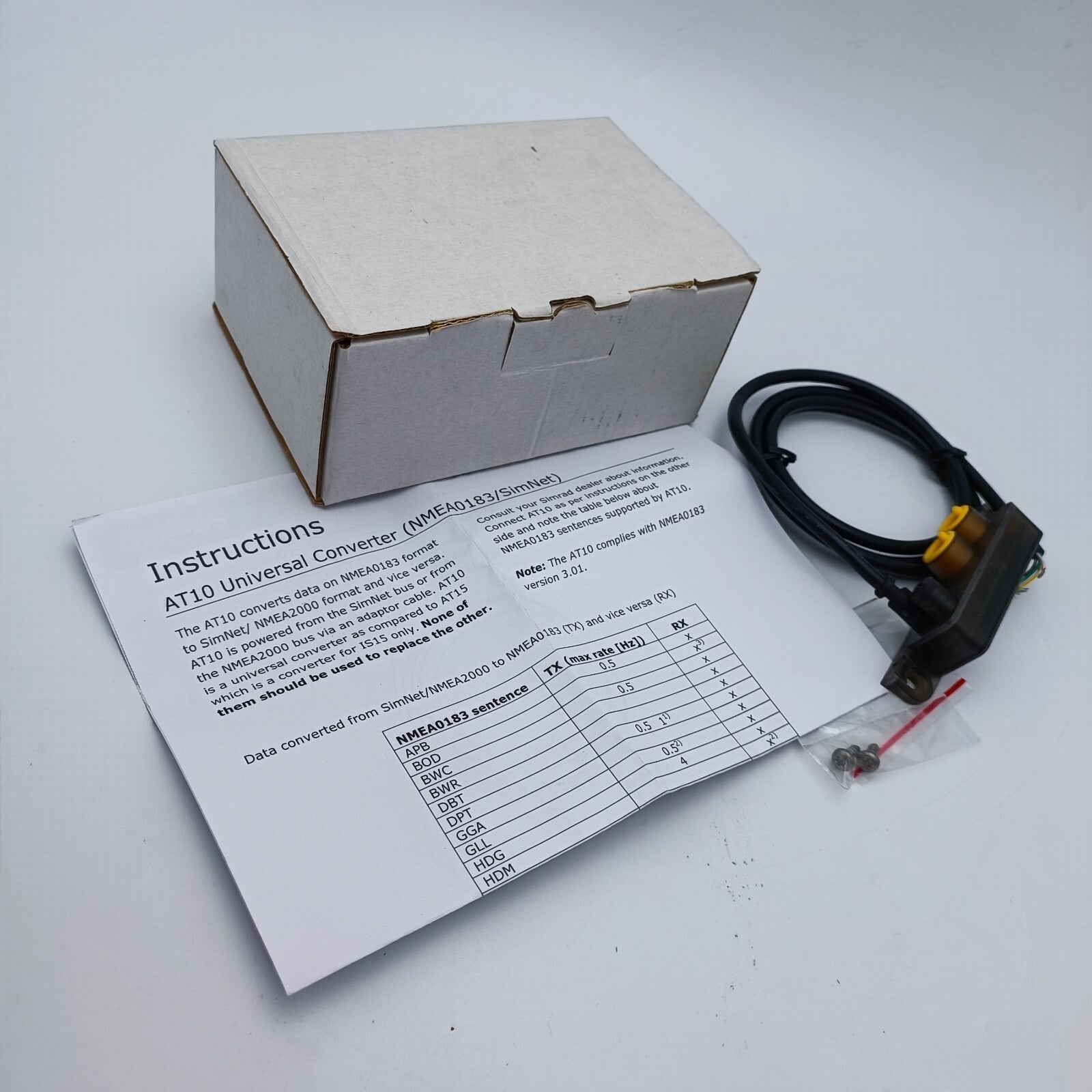 The AT10 converts data in NMEA0183 format to SimNet/ NMEA2000 format and vice versa. AT10 is powered from the SimNet bus or the NMEA2000 bus via an adaptor cable.