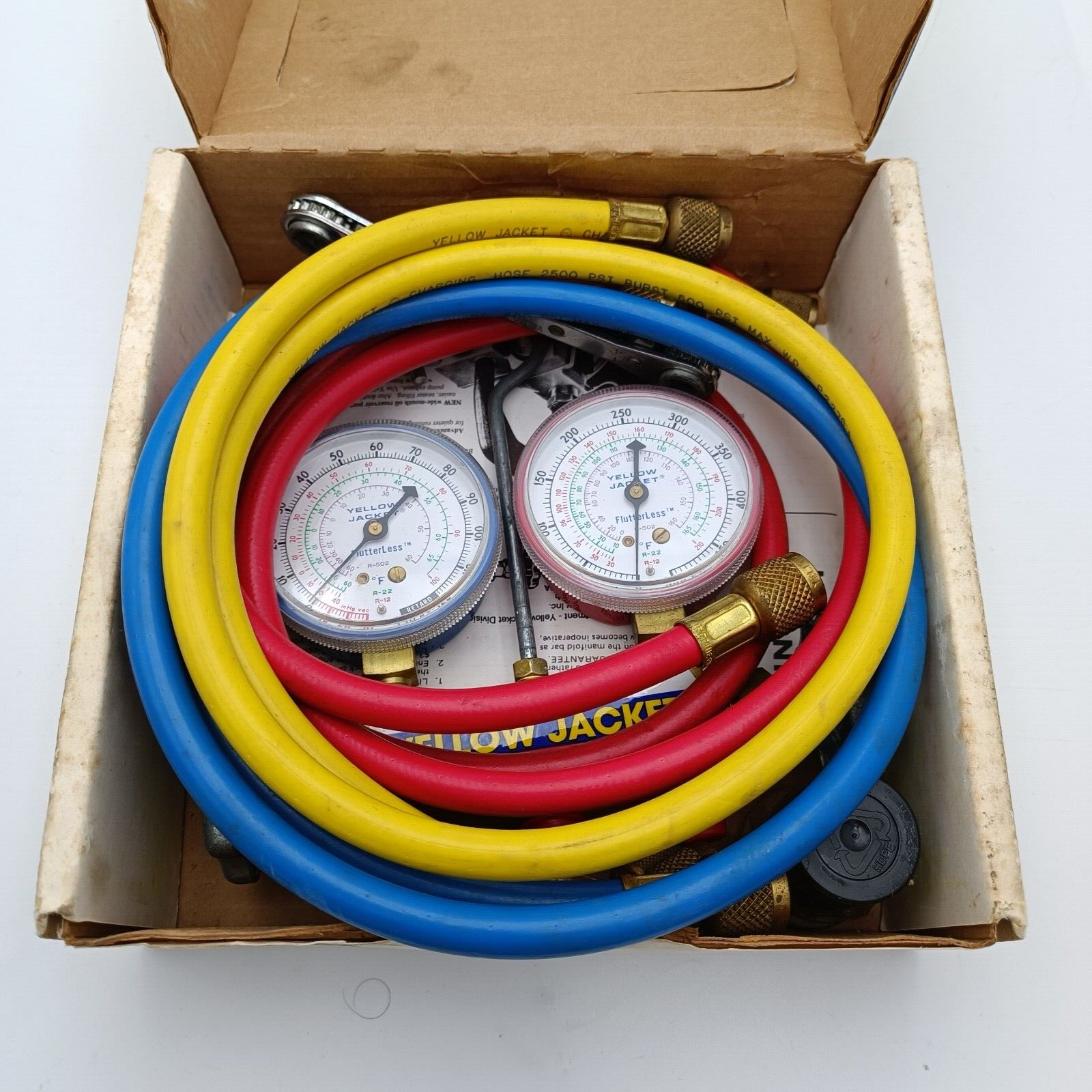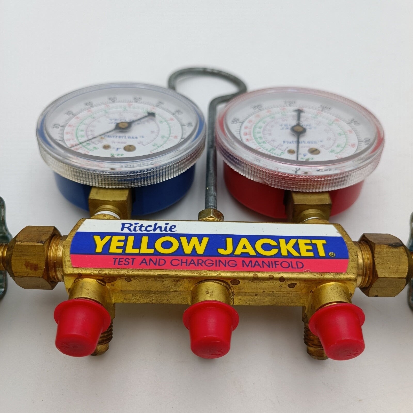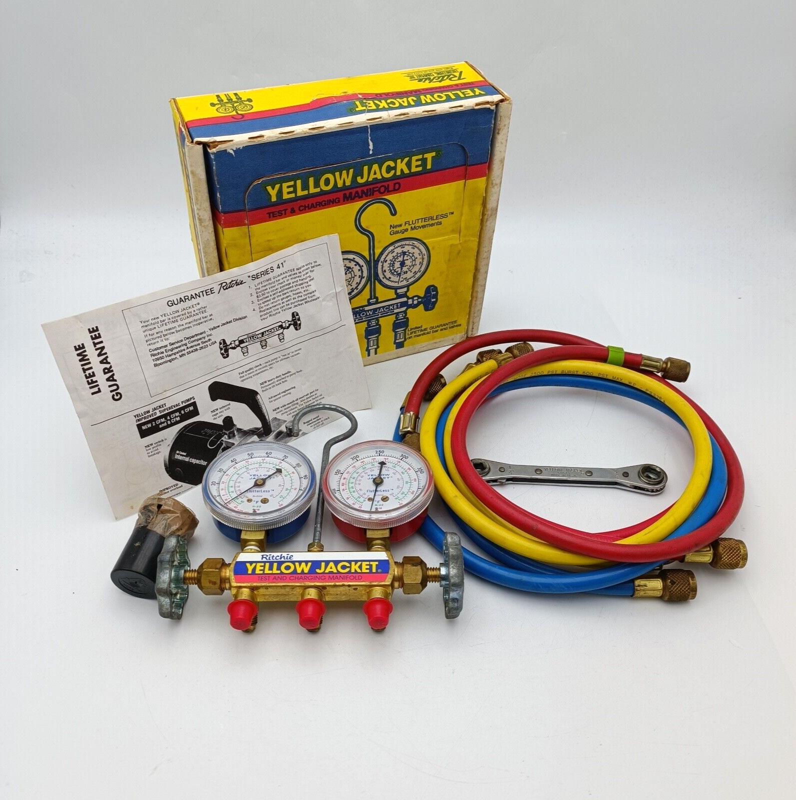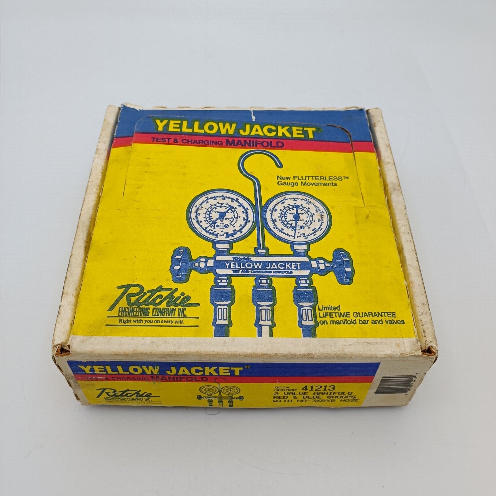 Yellow Jacket Ritchie 41213 Titan 2-Valve Test and Charging Manifold - Red / Blue Gauges with HA-36RYB Hose in an original box.
