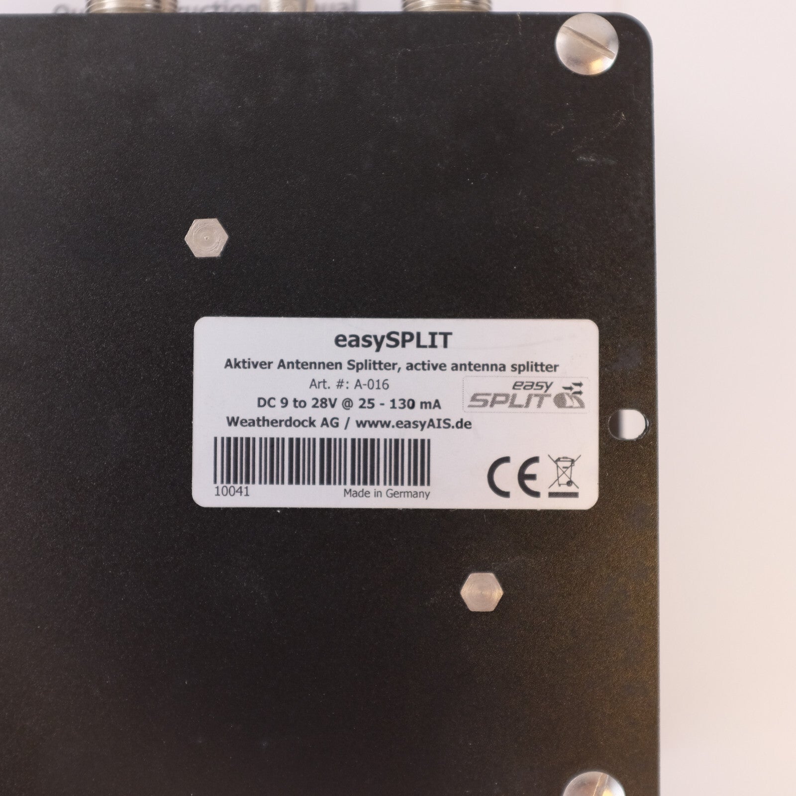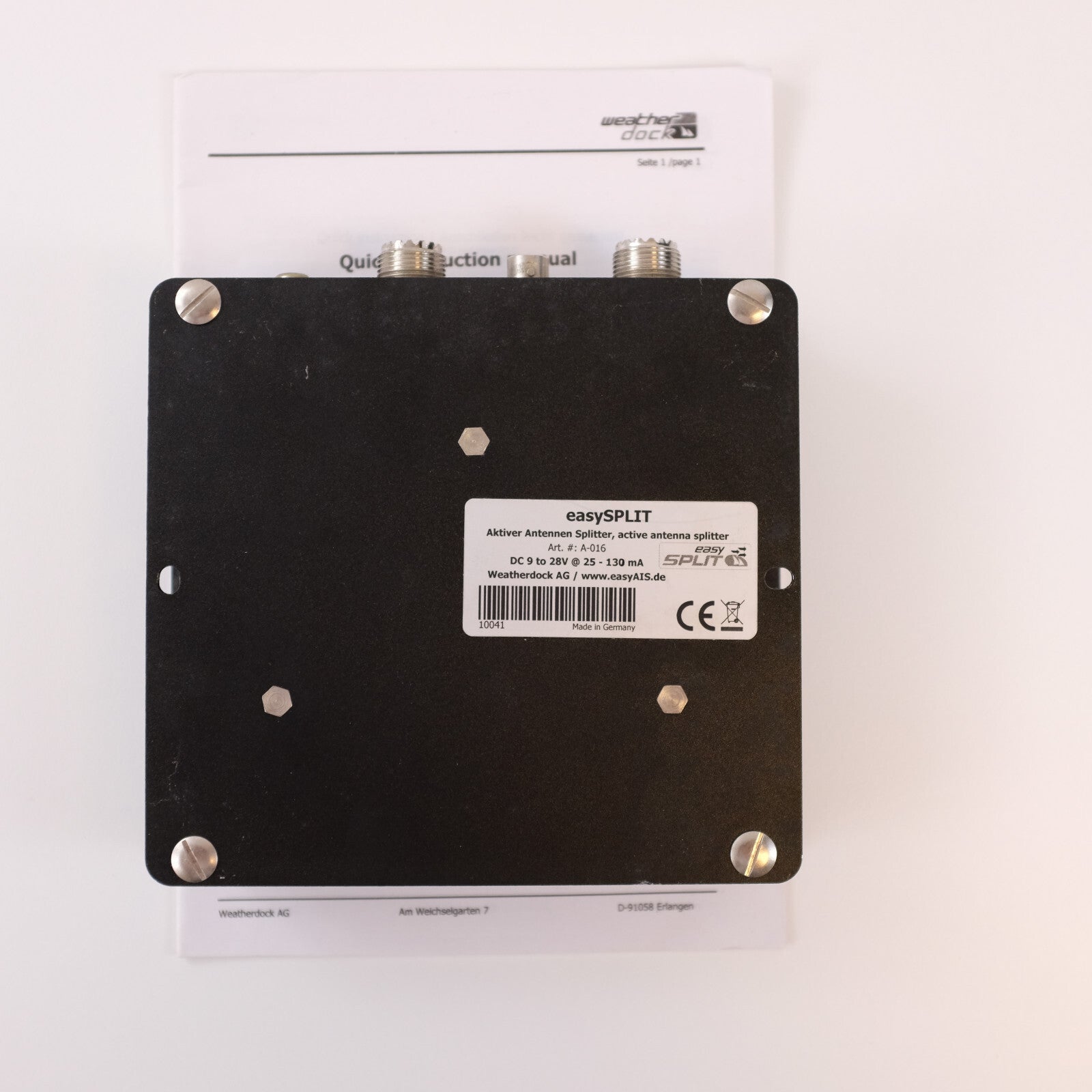 The easySPLIT allows the easy mounting of easyAIS to an already existing VHF antenna. With the easySPLIT, it is not necessary to install an additional antenna for the reception or the operation of an AIS receiver. Simply take the existing antenna cable of the marine radio and connect it to the splitter. Take a cable from the splitter to the radio and to the AIS receiver. Due to the extremely fast switching speed, the easySPLIT is also suitable for operation on ATIS radios. In addition, the easySPLIT has another output for the operation of a normal FM radio (for example a car radio). Delivery includes a power cable. CE approved. Dimensions: 150 x 150 x 30 mm, weight: 0.8 kg.
