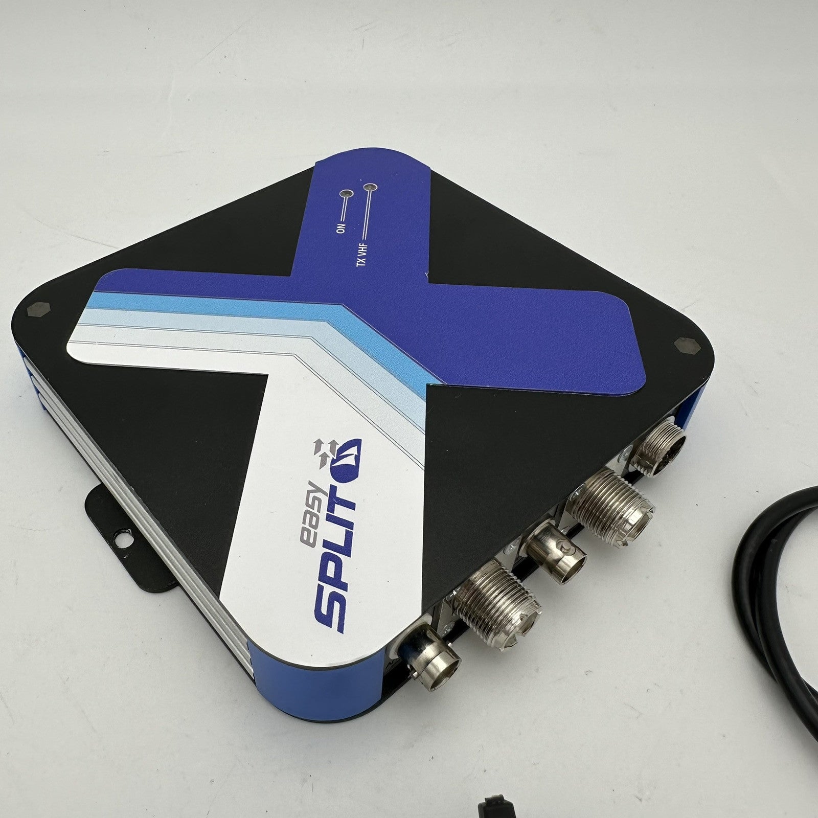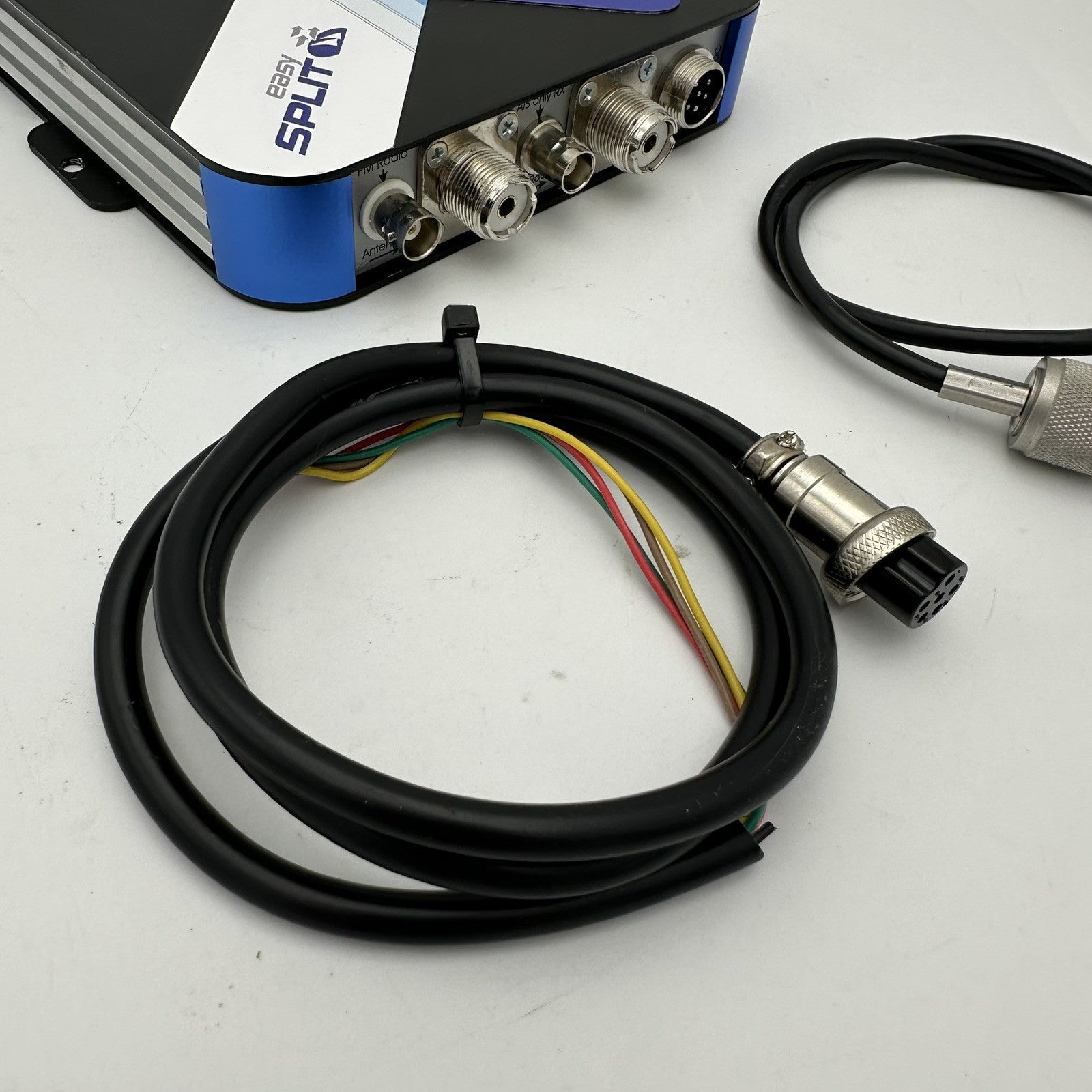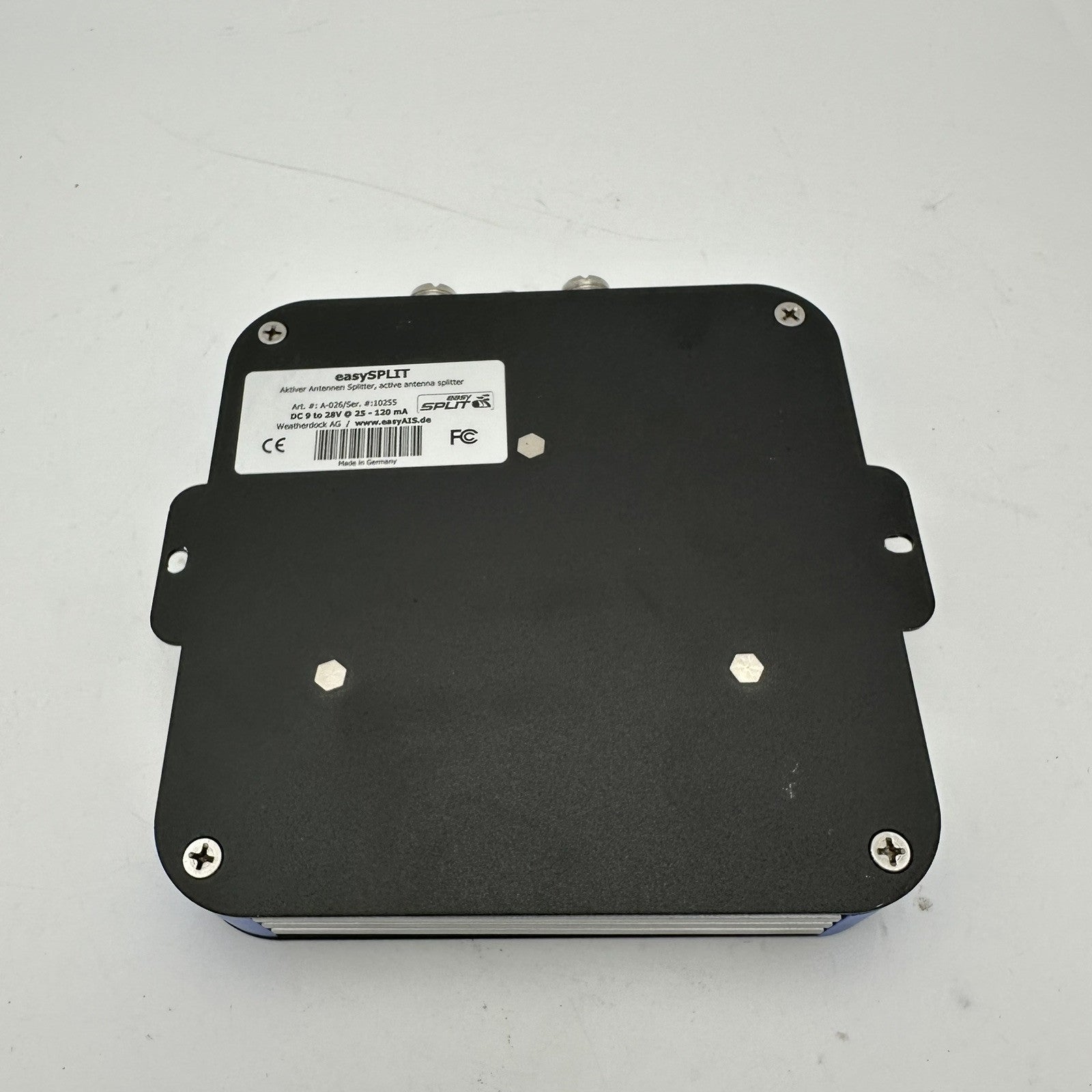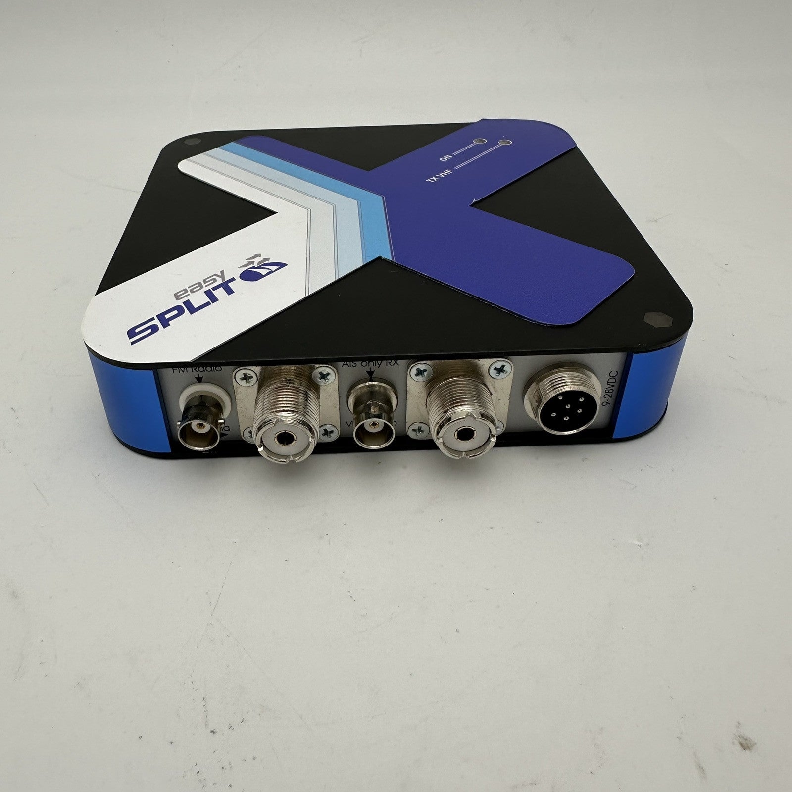 The easySPLIT allows the easy mounting of easyAIS to an already existing VHF antenna. With the easySPLIT, it is not necessary to install an additional antenna for the reception or the operation of an AIS receiver. Simply take the existing antenna cable of the marine radio and connect it to the splitter. Take a cable from the splitter to the radio and to the AIS receiver. Due to the extremely fast switching speed, the easySPLIT is also suitable for operation on ATIS radios. In addition, the easySPLIT has another output for the operation of a normal FM radio (for example a car radio). Delivery includes a power cable. CE approved. Dimensions: 150 x 150 x 30 mm, weight: 0.8 kg.