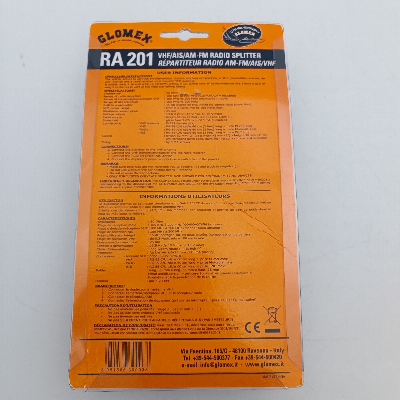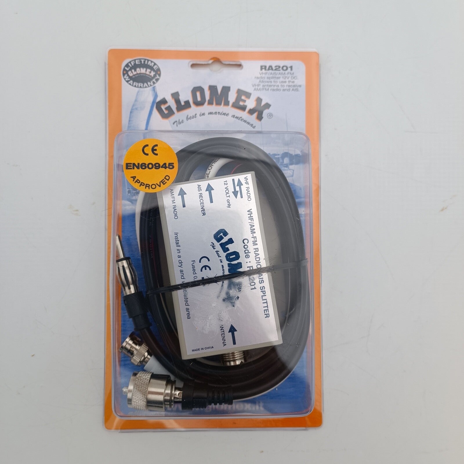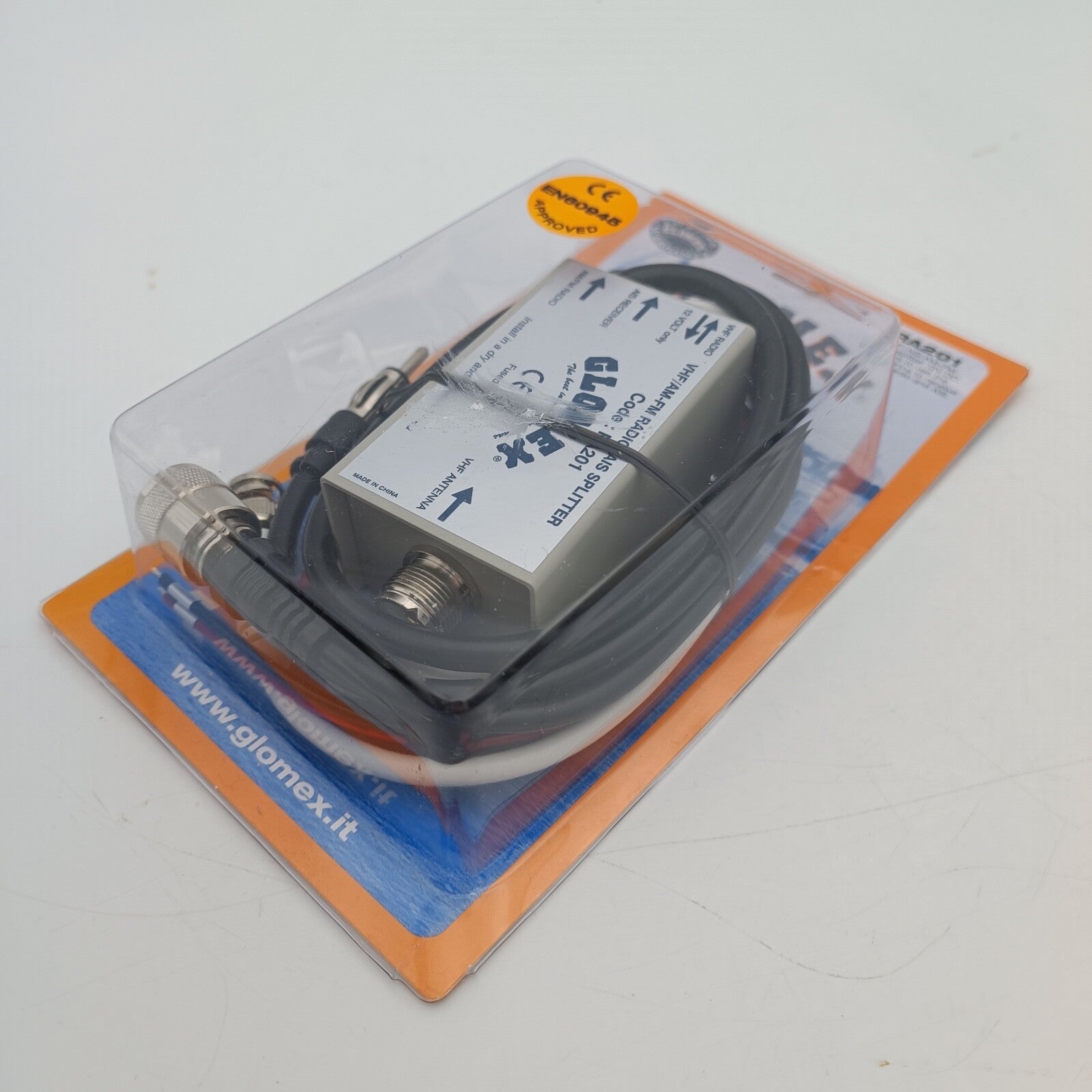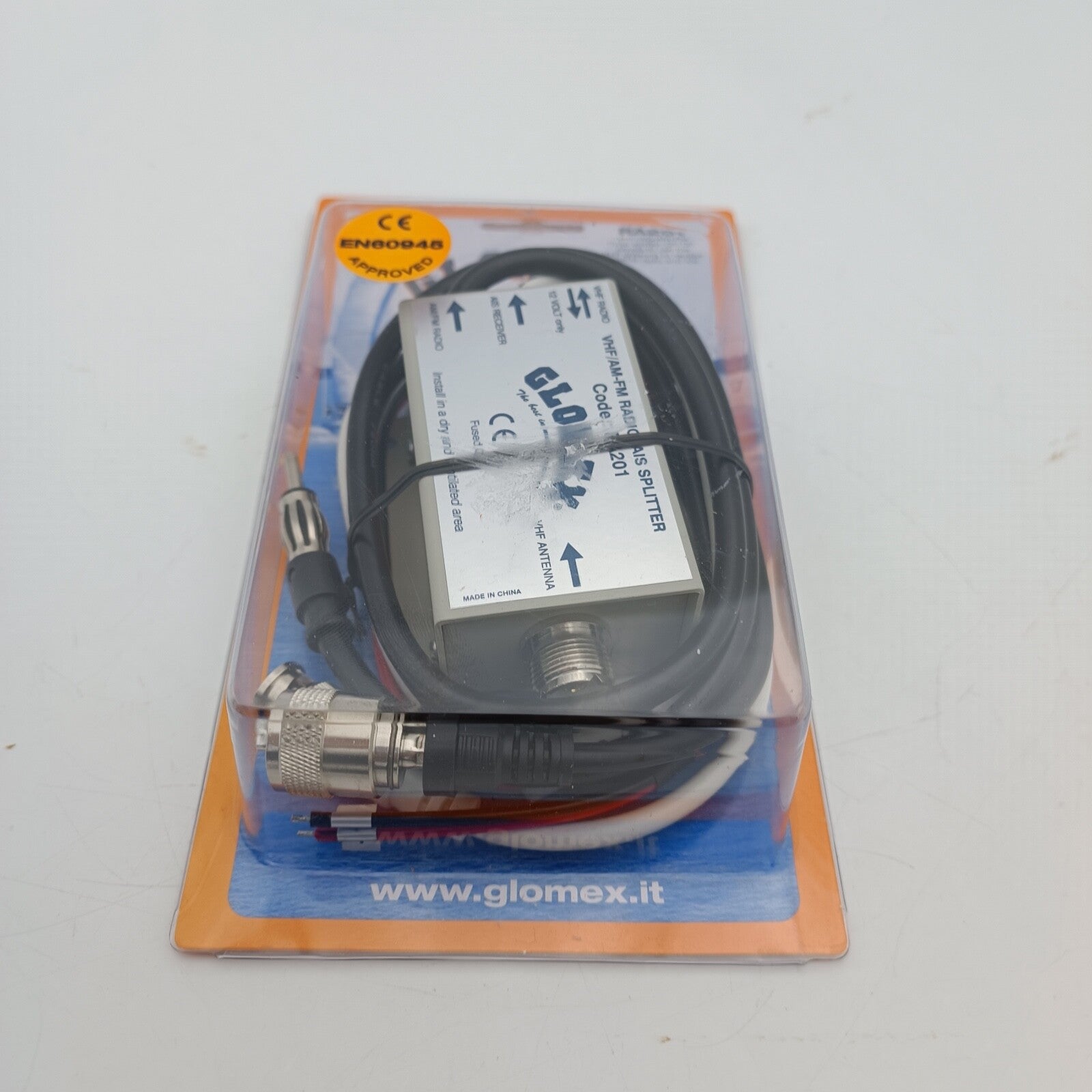 The marine radio antenna is connected with a SO-239 (PL-) socket on to the metal housing of the antenna splitter.