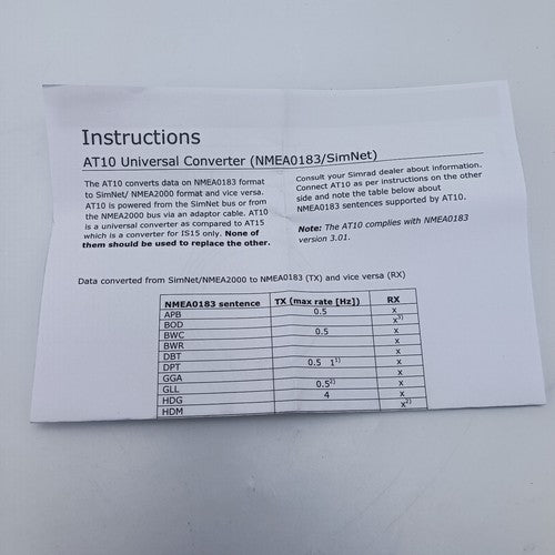 The AT10 converts data in NMEA0183 format to SimNet/ NMEA2000 format and vice versa. AT10 is powered from the SimNet bus or the NMEA2000 bus via an adaptor cable.